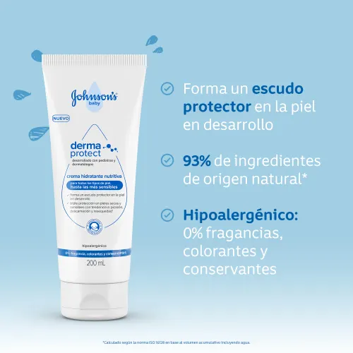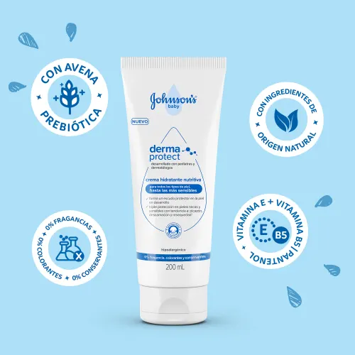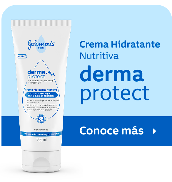 Crema Corporal Bebé JOHNSON’S® Derma Protect, que forma un escudo protector en la piel en desarrollo del bebé, con triple protección en pieles secas y sensibles con tendencia a picazón, descamación y resequedad¹. Su fórmula es ideal para todo tipo de piel, hasta las más sensibles. No es oleosa, es de rápida absorción y fácil de aplicar, facilitando la rutina con el bebé.