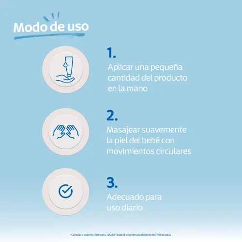 Aplicar una pequeña cantidad del producto en la mano y masajear suavemente la piel del bebé con movimientos circulares. Adecuado para uso diario.